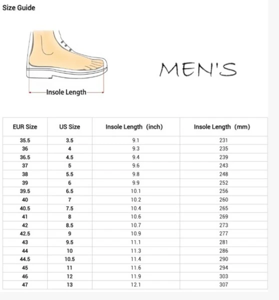 US 4 (Womens) (EUR 35), US 4 (Men) 5.5 (Women) (EUR 36), US 6(Women) (36.5) US 6.5 (Women) (EUR 37), US 7 (Women) 5.5 (Mens) (EUR 38) ,US 6 (Men) 7.5 (Women) (EUR 39), US 8 (Women) (EUR 39.5), US 8.5 (Women) (EUR 40) ,US 7.5 (Men's) (EUR 40.5), US 9.5 (Women) (EUR 41) ,US 8.5 (Men) 10 (Women) (EUR 42) ,Men's 9 (Women) (EUR 42.5) ,US 11(Women) (EUR 43) ,US 11.5 (Women) (EUR 44), US 12 (Women) (EUR 44.5) , US 11 (Men's) (EUR 45), US 12 (Men's) (EUR 46), (Men's) 13 (EUR 47)